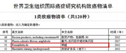 世界衛(wèi)生組織國際癌癥研究機(jī)構(gòu),公布的致癌物清單中,甲醛被放在一類致癌物列表中。甲醛被世界衛(wèi)生組織(WHO)確定為致癌和致畸物質(zhì),是潛在強(qiáng)致突變物質(zhì)。
